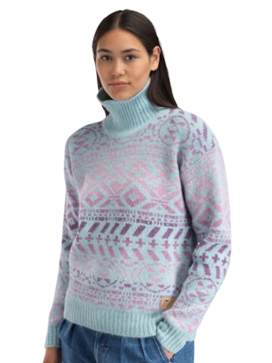 With a relaxed fit and a high neck, the Highland sweater delivers a bold, soft, and strikingly patterned style. There is playfulness in both the color choices and the textures. The airy and luxurious alpaca yarn forms a solid base. The pattern is knitted in a cotton yarn with an ombré effect, where each cotton thread has graduated colors. This yarn also has a flatter structure. Together, this creates both contrast and depth, making it a sweater that truly stands out.
