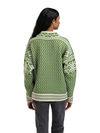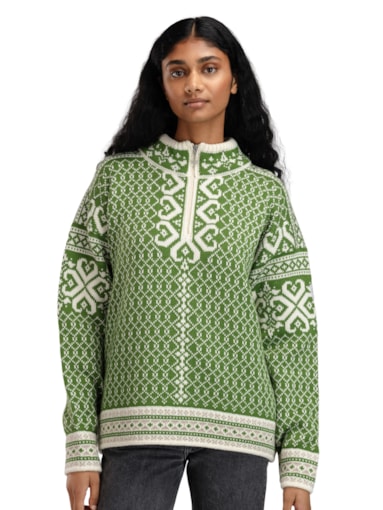 A heavy knitted, detailed, patterned wool sweater with a relaxed fit. The sweater has a semi-high neck with zipper and is knitted in 100% long-lasting wool. You can use Leknes both as a hiking sweater and for everyday wear. With a traditional Norwegian pattern and updated fit, this is a wool sweater that is both timeless and nostalgic.