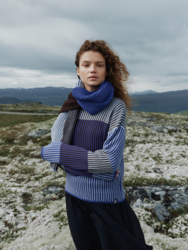 • A playful sweater with a relaxed, dropped shoulder giving a wide fit. The sweater is knitted in a tonal palette and a structured effect giving a rib look-a-like. Despite the split look, the front, back and sleeves of the sweater are knitted as whole pieces. The high neck is single knitted with a wide shape for comfort and room.