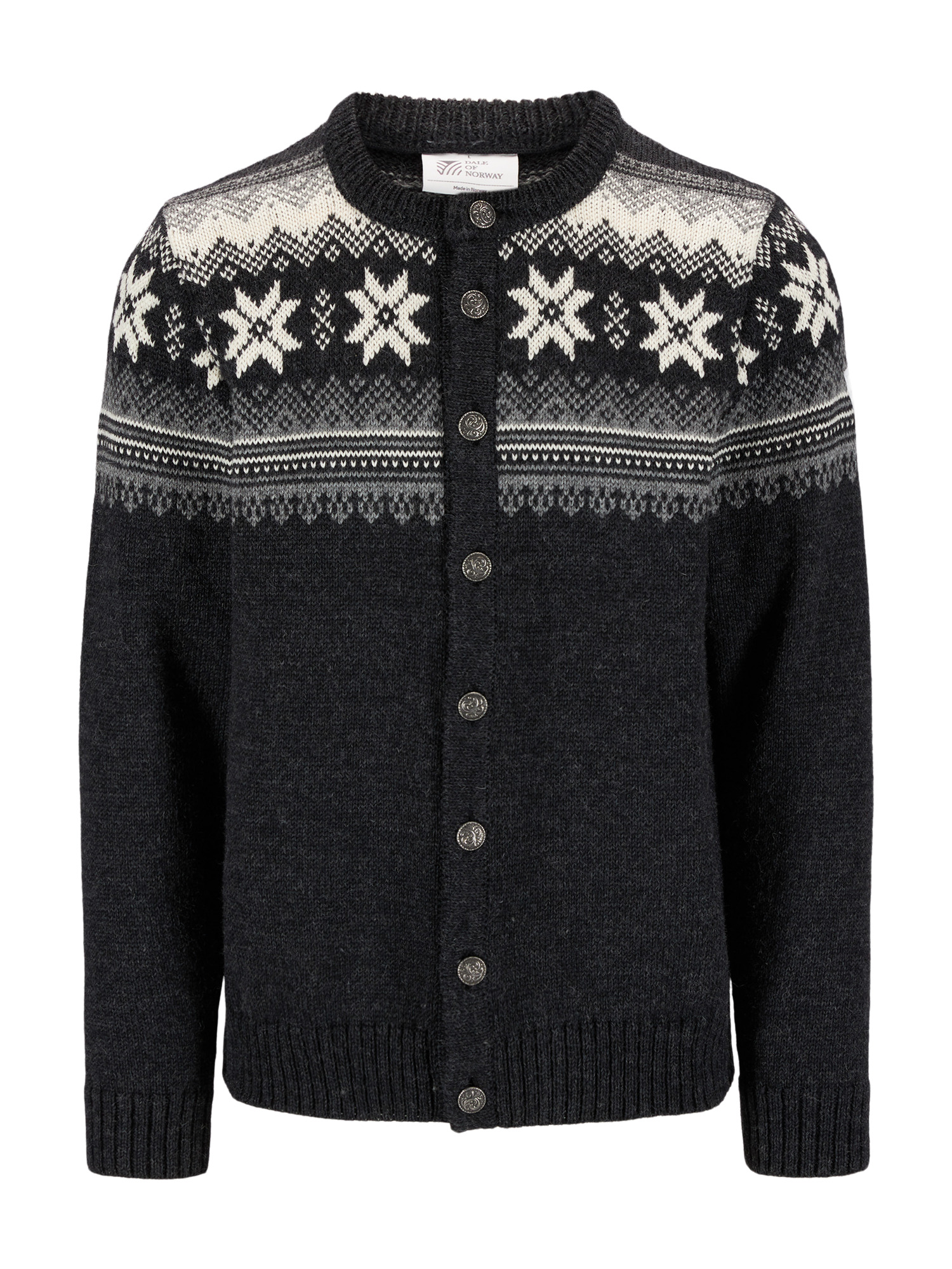 A classic, retro wool jacket with detailed patterns reminiscing back to the 1950s and 60s. The jacket has a front button closure with Norwegian-made pewter buttons. The Veafjord is knitted in 100% long-lasting Norwegian wool, making the wool jacket extra warm and durable.
